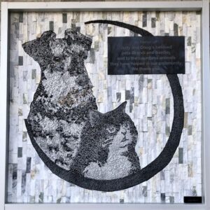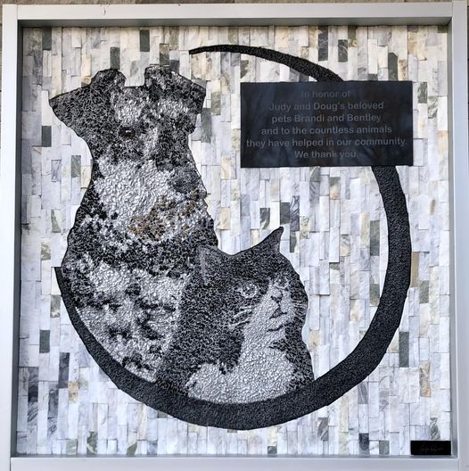 The Dignity of Brandi & Bentley was commissioned by the Board of the Johnson City / Washington County Animal Shelter – Judy and Doug Lowrie Spay & Neuter Clinic in 2022. Artist Angelique Fraley worked from photographs of Judy and Doug Lowrie’s personal pets to construct a mosaic image created with natural stone pebbles. Material for construction included a variety of natural stone pebbles, custom cut marble, and concrete mortar. The stone mosaic wall mural was commissioned in honor of the Lowrie’s commitment to their work and the construction of the new Spay & Neuter clinic. It is located on the exterior wall of the new addition to the Johnson City / Washington County Animal Shelter – Judy and Doug Lowrie Spay & Neuter Clinic and is in view for the public to appreciate.