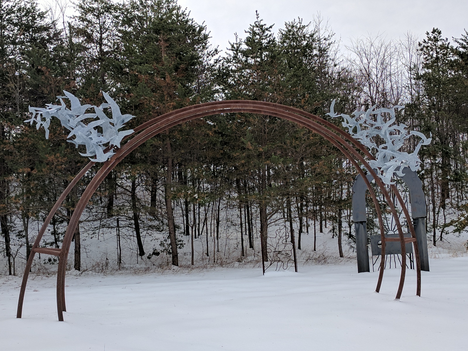We live in many realms – water, earth and sky. The arch represents the earth. The outer edge of the radius is the horizon or sky. This is the realm that the creatures of flight live in. My sculpture honors the wonder and awe these creatures give us each day.