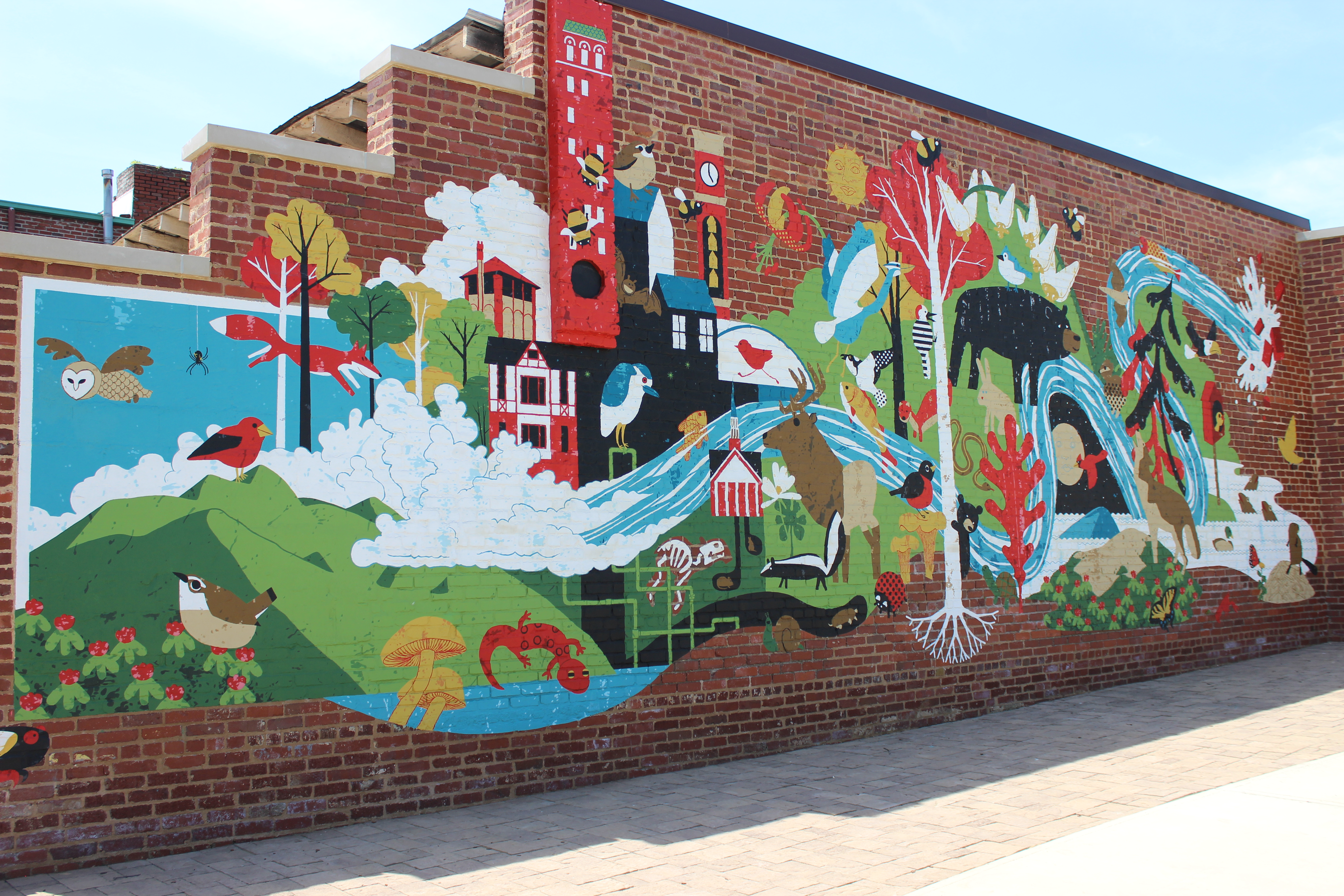 A central focal point in the park at King Commons is a large painted mural entitled Wildabout on a wall adjacent to the Atlantic Ale House. Artist Ian Brownlee spent much of the summer of 2016 working on the bold, energetic mural which is now a wonderful addition to the city’s growing public art collection. Selected from more than 30 applicants, Brownlee’s design reflects themes explored throughout the park: sustainability, water mitigation and pollination. His mural includes a dizzying array of native flora and fauna. He also imbued the design with a unique sense of place by incorporating significant architectural landmarks from our region.