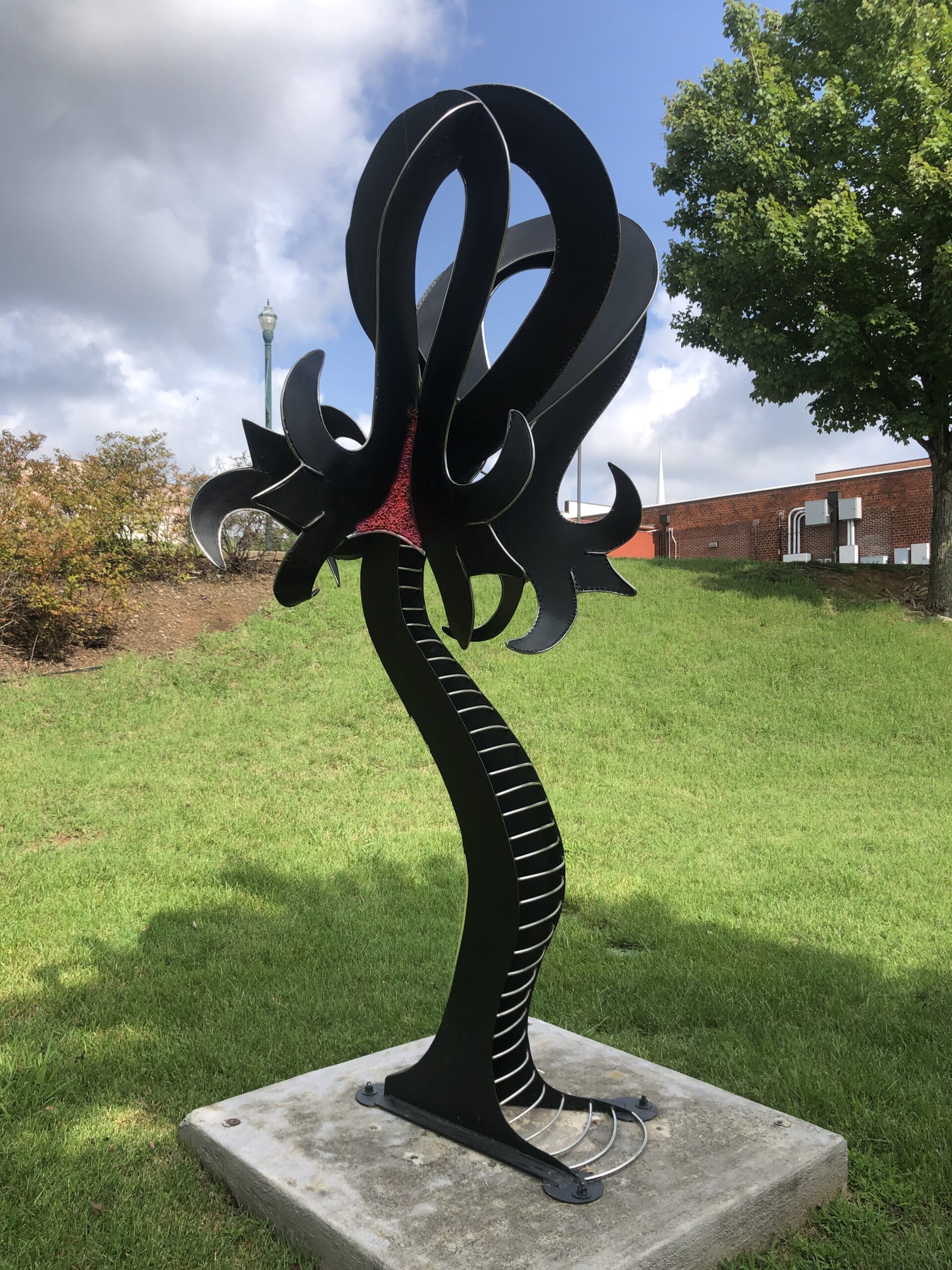 The shape of the blooms is similar to the “fleur de lis” symbol referring to an elegant flower/lily. In nature, black flowers are uncommon and rare, creating high contrast to the bright pink apple snail clusters I encountered in Ocala, Florida. Framed in stainless steel and chrome, these dissimilar elements came together into a self-made puzzle to adorn this giant steel bloom. A combination of beauty, strength and mystery.