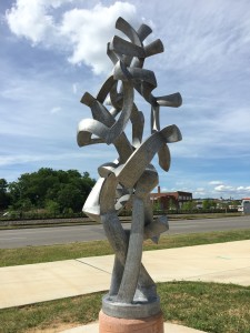 “A Refusal to Stop and Ask for Directions” $14,000 Aluminum, 80″ x 30″ x 30″ (+ base: 15″ tall x 16″ dia.) total height with base = 8′ Sponsored by: Tupelo Honey