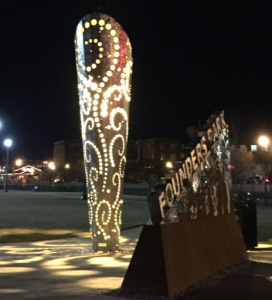 Genesis is the western entrance to the park and the first work commissioned by the Public Art Committee. Those who look closely can find birds, bees, and butterflies among the flowers depicted on this gateway. At night its light welcomes passersby to downtown Johnson City.