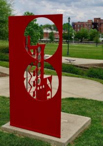 ‘Tangent Circles’ is a sculpture designed to inspire and invite the viewer to walk around the piece and experience the changes in its geometry. It has an exciting red color and silver color stainless steel accents. It contains some recycled metal elements. The open circles can be frames in photo portraits as we look beyond ourselves.