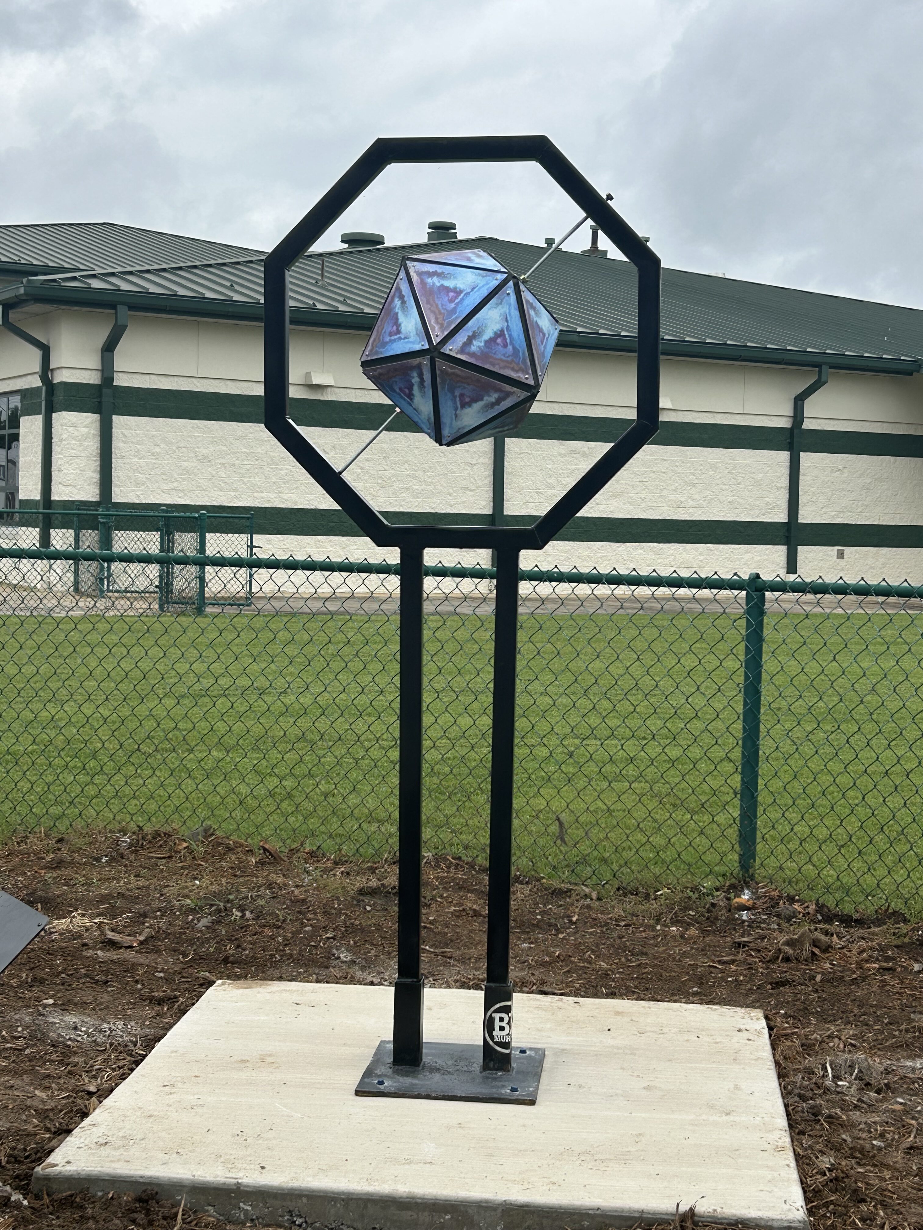 Icosahedron, or 20-sided polygon, celebrates the mathematical beauty of the Platonic Solid Family. They are displayed, almost floating, in a 2” square tubular steel octagon frame standing 8’ high. The form itself spins when provoked, adding to the excitement and wonder.