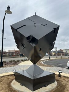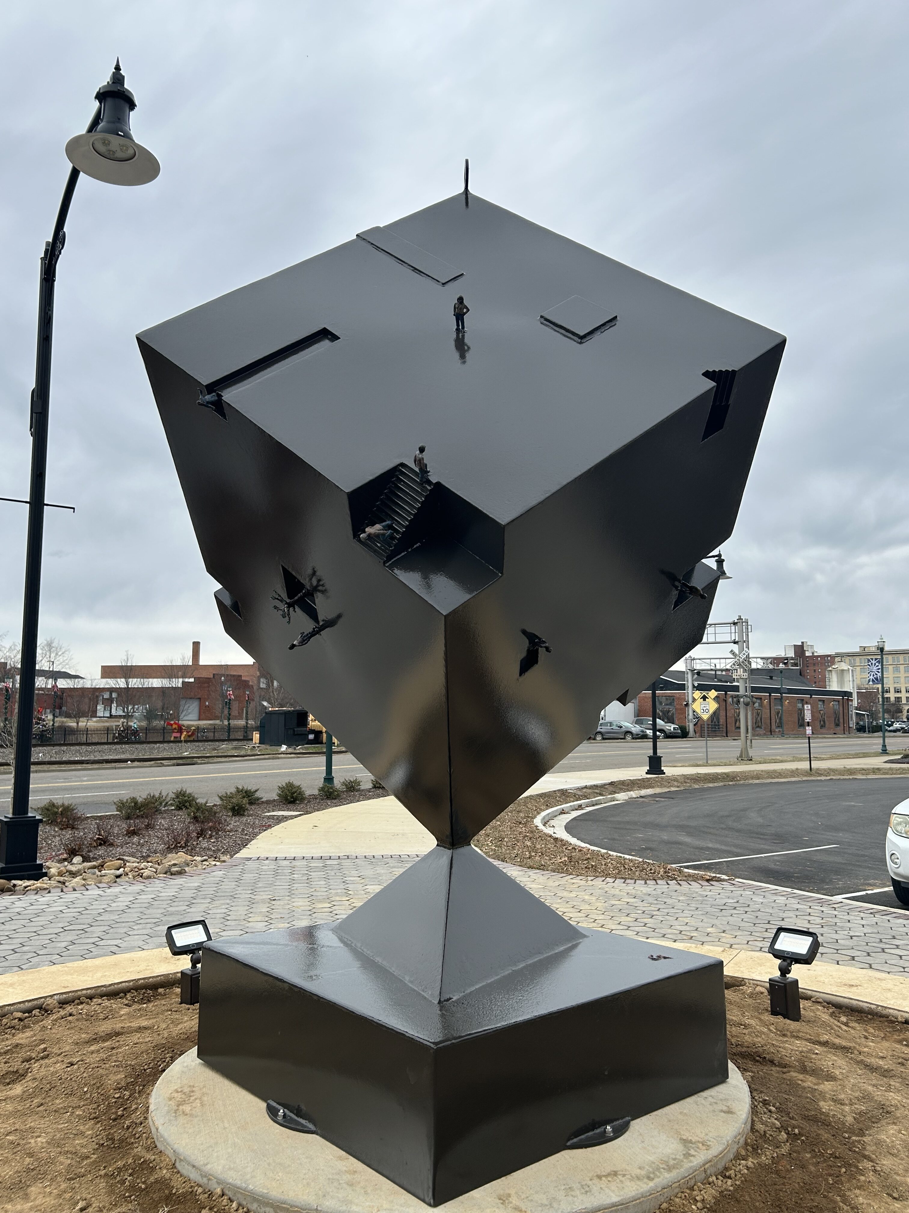 Enigma…a strange architectural construct shaped like a cube balanced on one of its vertices with people walking, standing and sitting on different sides in apparent defiance of the laws of gravity.