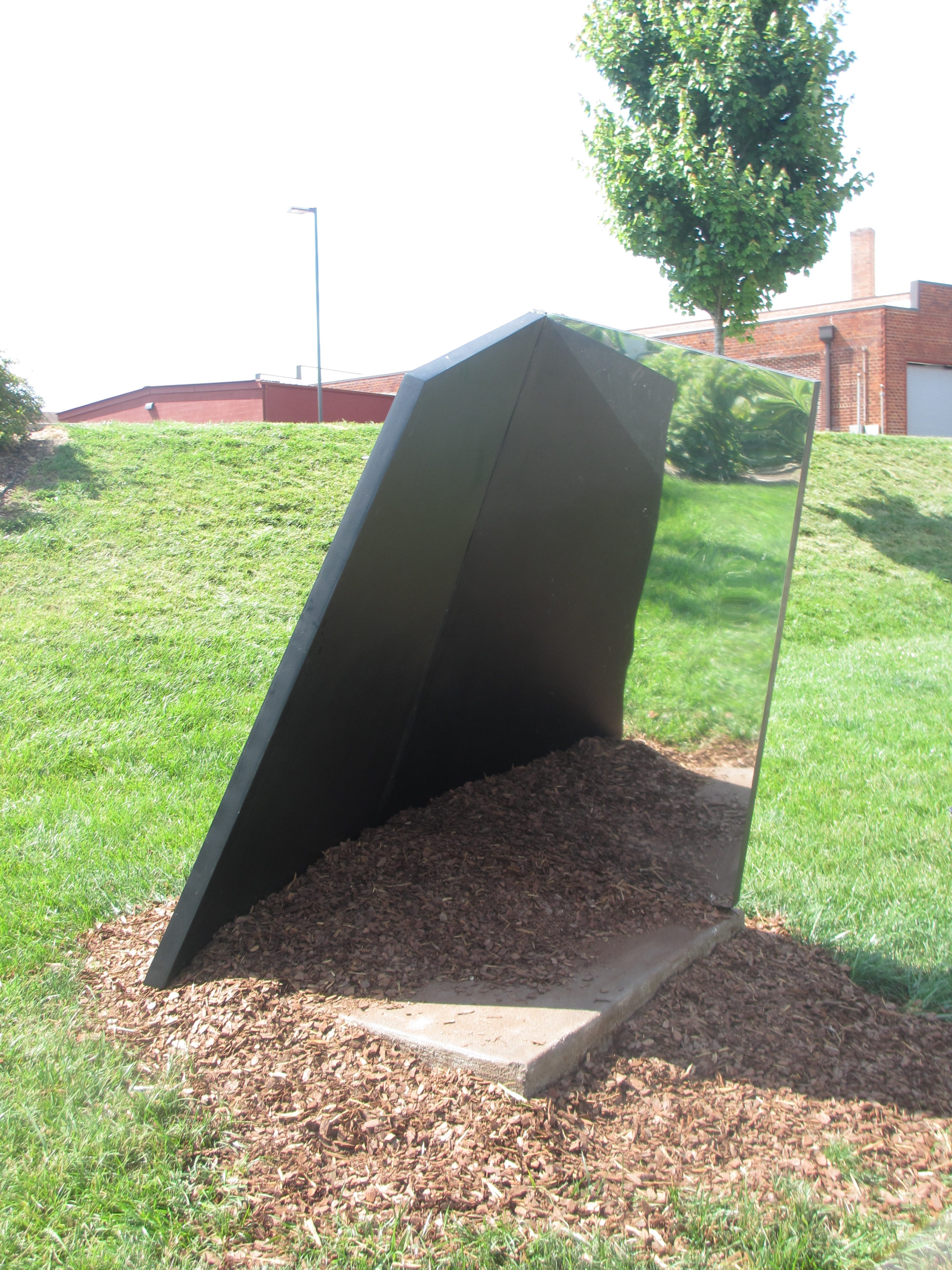 The idea behind “A Few Degrees from Plumb and Square” was to create a piece that when viewed in passing the viewer questions what he had just seen and it requires going back for a second look. The reflection of the opposite side of the piece, along with the images of its surroundings, provides the viewer with questionable information that requires clarification. i.e. a second look. It is remarkable how if one takes the time to explore their surroundings they find interesting things. Things that may be recent additions, or been there forever, just never noticed before.