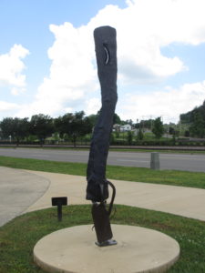 My sculpture Dark Crescent makes reference to the standing stones I have seen in Ireland. They stand silently but evoke a connection to our Neolithic past. Where they stand makes where they stand unique. They create a “name place”. Are they some marker of boundaries or some directional supplement? This particular one has a slice through its top in a crescent shape. Why is it there? What does it tell you? The blue black darkness of the sculpture makes the crescent the lightest element of the sculpture. A tribute to the moon? Is it a commentary of the conjunction of darkness and light in the heavens and on the earth?