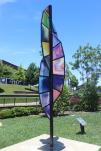 Using similar fabrication processes, the Feather is created by programming a CNC machine to cut the panels to shape out of MDO plywood. They are then sanded, routed and primed, and using a large format, flatbed printer, the swirling, stained glass looking designs are directly printed on top. A final coating of hard, self-leveling, epoxy resin is applied to both sides to withstand the elements.