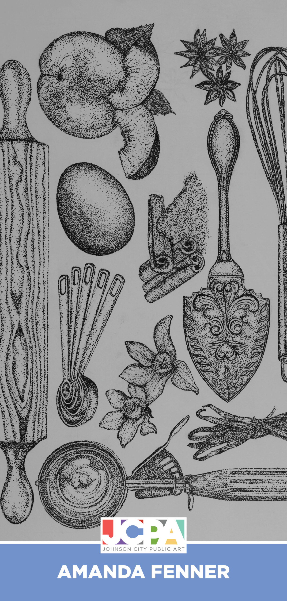 From the artist: I have always been fascinated by the deep relationship between food, family, place, and cultural identity. Growing up, family gatherings centered around colorful, Pyrex-strewn tables, each dish wholly representative of its creator. It was so much more than food. It was memories and stories, soft hearts and weathered hands, the deepest grit. Pin & Whisk was created to immortalize the tools of this trade, the means by which a family shared its love language.