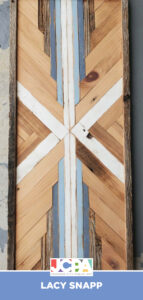From the artist: This Art Deco design was handmade by Luna’s Woodcraft from reclaimed barnwood locally sourced in East Tennessee. Each barn Old Farm Reclaimed Lumber rescues is being saved from destruction due to urban sprawl. This piece is completely made of pine wood in two different ways. The first, planed natural pine that features the wood’s natural grain and various knot character. The second, grey board straight off the barn. Various strips of this piece were painted with white and blue acrylic paint in order to create this Art Deco design, mimicking the Empire State Building. This piece is finished by being framed using reclaimed wood.