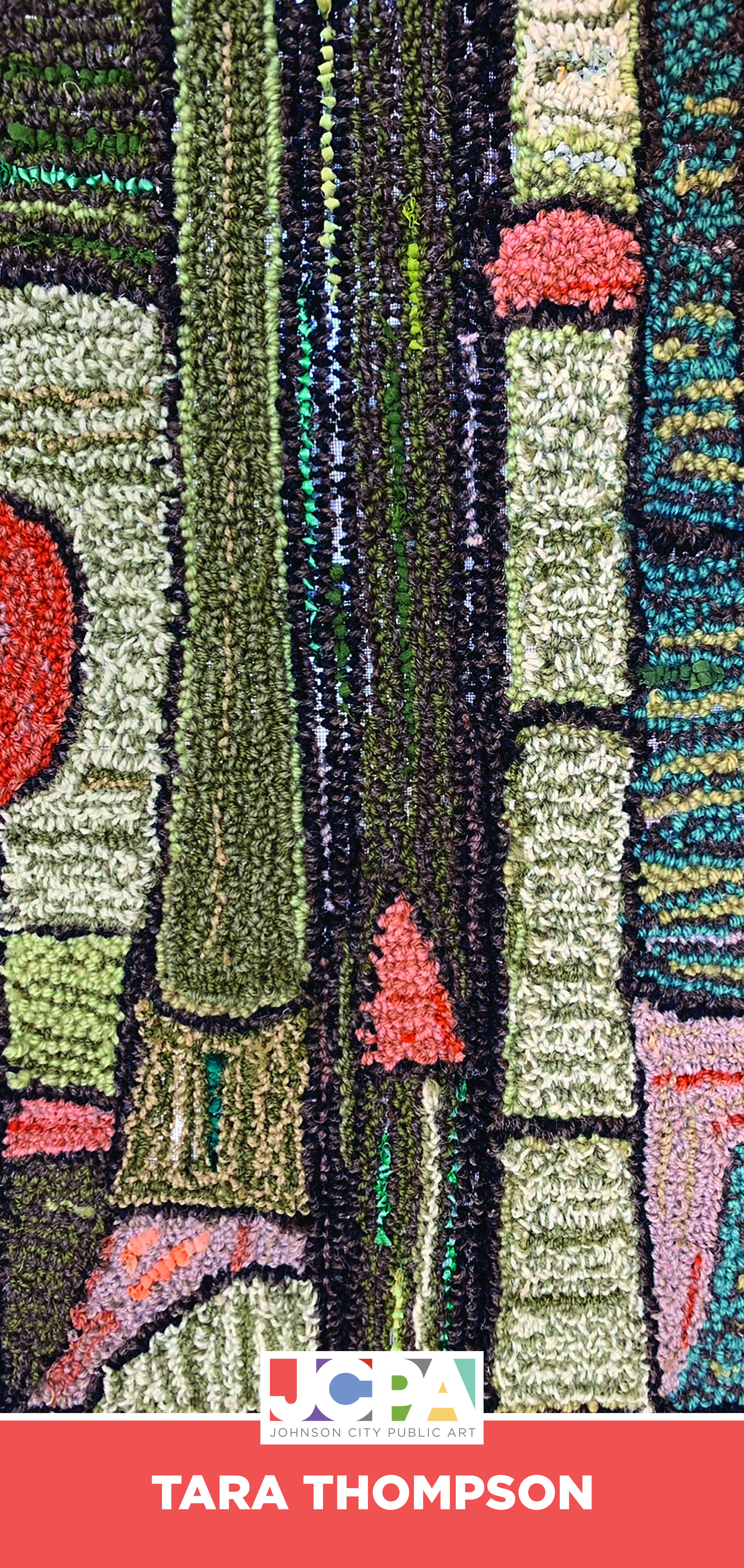 Photograph of a tufted rug created using wool yarn and up-cycled fabric I hand-dyed and tufted onto backing. I intended this piece to be a reflection of the bountiful natural scenery that surrounds us in the area.