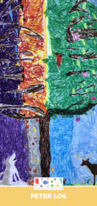 I created my banner with paint sticks, markers, and one sticker for the cardinal’s eye. For my inspiration, I remembered artwork I have seen about “To everything there is a season.” I chose one animal for each season: a howling wolf for winter, a shy hedgehog for fall, a munching squirrel for summer, a doe for spring, and my favorite year-round bird, the cardinal, to wrap it up. I love climbing the trees in my yard, and noticing how they change from blooming buds, to lush leaves, to golden leaves, to icicles. In my artwork, you can see both the moon and stars, and the sun and clouds, at the same time! When people see my banner, I hope they think about our amazing world that we care about so much.