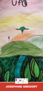 Josephine drew a lovely sunset scene with a lake and trees. She sketched a UFO and added some smudging to the color coming down from it to look like it was moving. She thought the UFO would look strange included in the peaceful setting she had created and hoped it would make people give it a second look.
