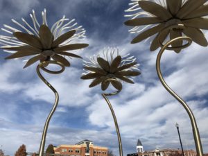 This sculpture was commissioned to commemorate Johnson City’s 150th anniversary, and the sculpture unveiling took place during the Sesquicentennial Celebration Grand Finale on December 1st, 2019. In keeping with themes of native flora and fauna present in the park, artists Jeff Reed and Jennifer Madden chose to pay tribute to Tennessee’s state wildflower (the passion flower) in their design. These three passion flowers mimic the three stars in the Tennessee flag and are sure to capture your attention with their rotating petals and 150 color changing LED filaments.