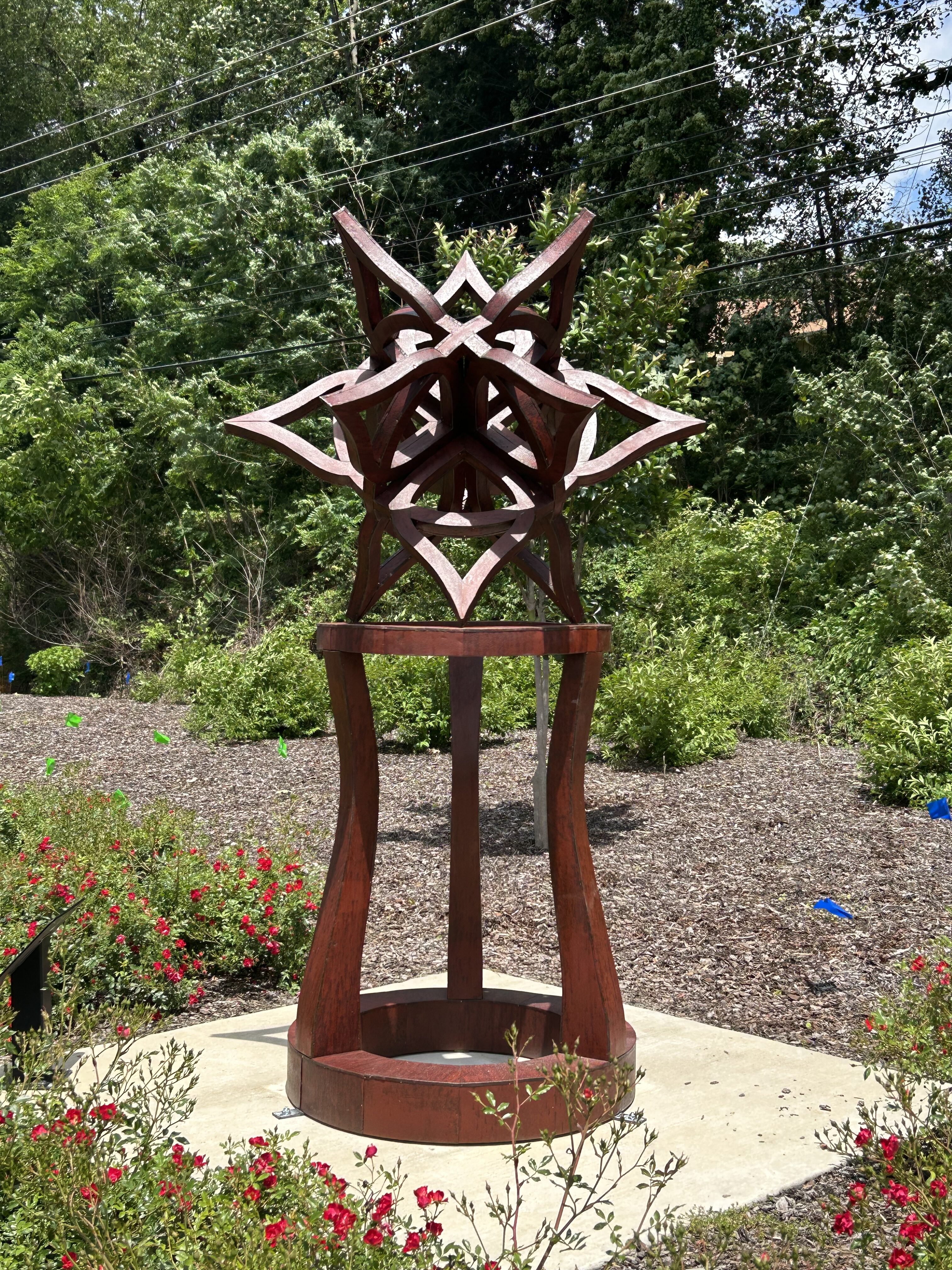 Red Astral Plane is a geometric construction. It was created by intersecting three identical, quaternary patterns at right angles along the centerlines of each pattern. There is an organic feel to the shapes in the patterns of this piece, like a leaf or a flower petal each extending outward from the center. As you walk around the sculpture the flow of curves, circles, and intertwining intersections change, moving from one perspective to another revealing more mysteries and interests.