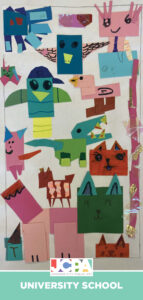 First grade artists at University School love art and creating in all forms! These collage animals were inspired by the artwork of Charley Harper.